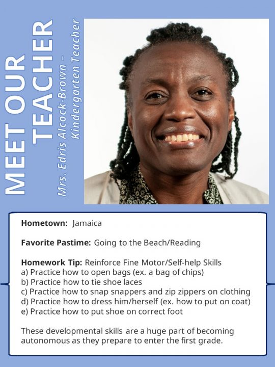 My name is Edris Alcock-Brown. My family and I relocated to Pooler in 2016 from Florida where I previously taught Kindergarten for seven years, Voluntary Pre-Kindergarten for two years, and also taught three-year-olds for two years. I joined the Savannah Adventist Christian School family as Pre-K/Kindergarten Teacher for the school year of 2017-2018.